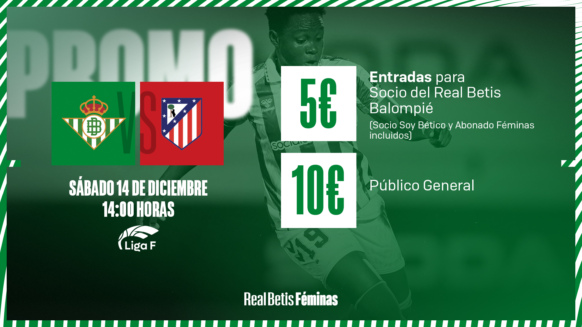 Para ello, el Club pone a disposición de los aficionados entradas a 10€ para el público general. Además, los abonados del Real Betis Balompié y Soy Bético podrán adquirir hasta dos localidades a 5€ cada una en taquilla física el día del partido o de manera online introduciendo el ID y pin de abonado en el proceso de compra dentro de la opción aplica tus promociones y descuentos. Esta promoción será también aplicable para los abonados del Real Betis Féminas, pero solo podrá ser efectiva en taquilla presentando el abono. Todas ellas hasta completar aforo.